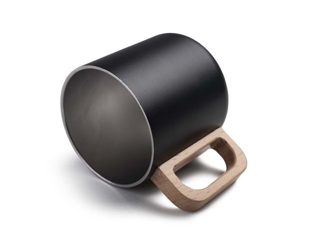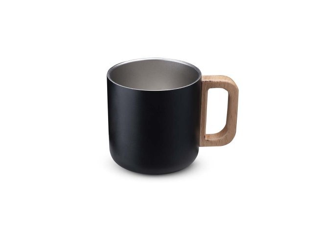 Caneca térmica com capacidade de 400ml, parede dupla em aço inox (304 interno / 201 externo), alça em madeira.