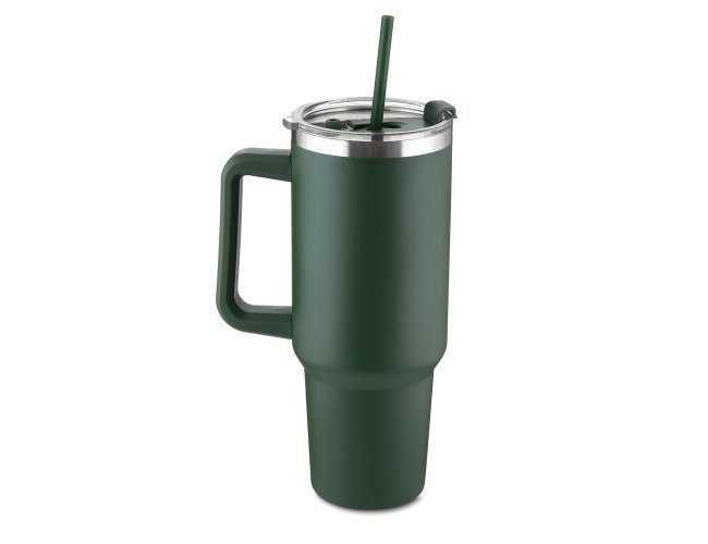 Caneca térmica de 1,3 litros em inox reciclado com parede dupla (interno 304, externo 201), acabamento em pintura a pó, tampa e canudo em plástico PP na cor do produto.