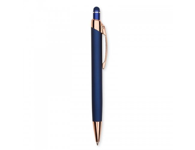 Caneta metálica com carga esferográfica azul de 1,0mm e acionamento por clique de revestimento emborrachado para interação em dispositivos com telas sensíveis ao toque.