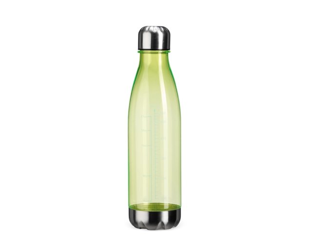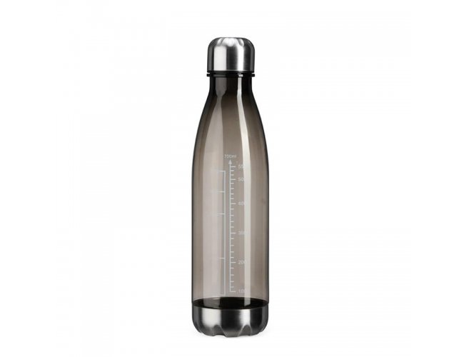 Garrafa plástica translúcida com capacidade máxima de 750ml e marcação de volume até 700ml. Conta ainda com base e tampa rosqueável em alumínio.